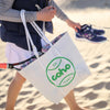 Our Medium Sea Bags Tote w/green logo has a lobster clasp up top, hand-spliced hemp rope handles, and a hanging zippered pocket. Its great as an every day warm weather tote, a beach bag, or even a tennis bag (racquets fit).